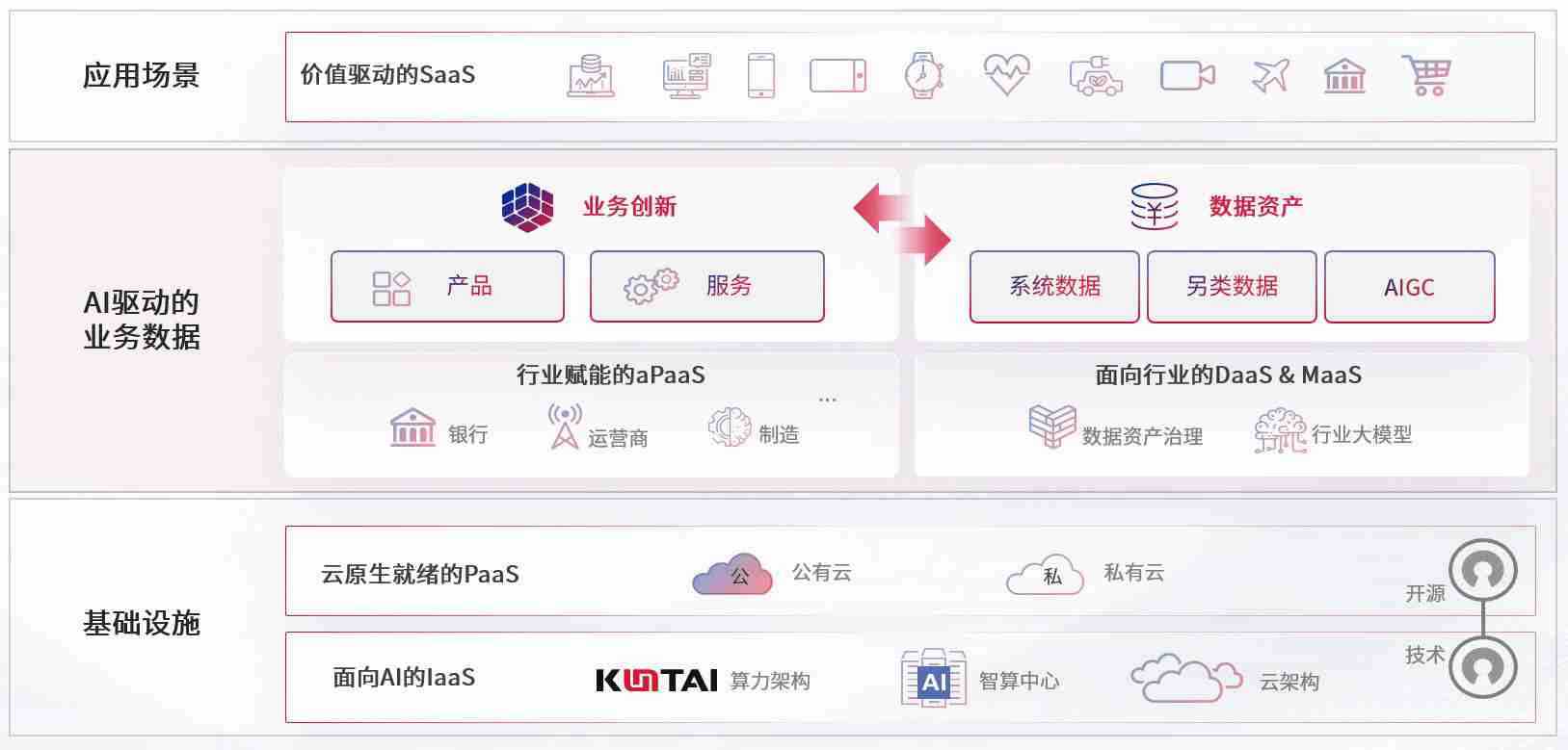数字时代,,围绕企业数字化转型的关键要素,,,,尊龙z6数码开创性的提出数云融合战略和技术体系框架,,,,着力在云原生、、、数字原生、、、、AI原生和信创产业上架构产品和服务能力,,为处在不同数字化转型阶段的快消零售、、、、汽车、、、、金融、、、、医疗、、、政企、、、、教育、、、、运营商等行业客户提供泛在的敏捷IT能力和融合的数据驱动能力,,构建跨界融合创新的数字业务场景和新业务模式,,,,助力企业级客户建立面向未来的核心能力和竞争优势,,,,全面推动社会的数字化、、智能化转型升级。。