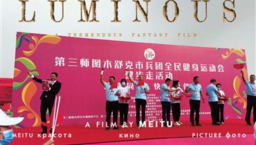 7月10日,,第三师图木舒克市兵团全民健身运动会健步走活动在永安湖生态旅游区举行。。